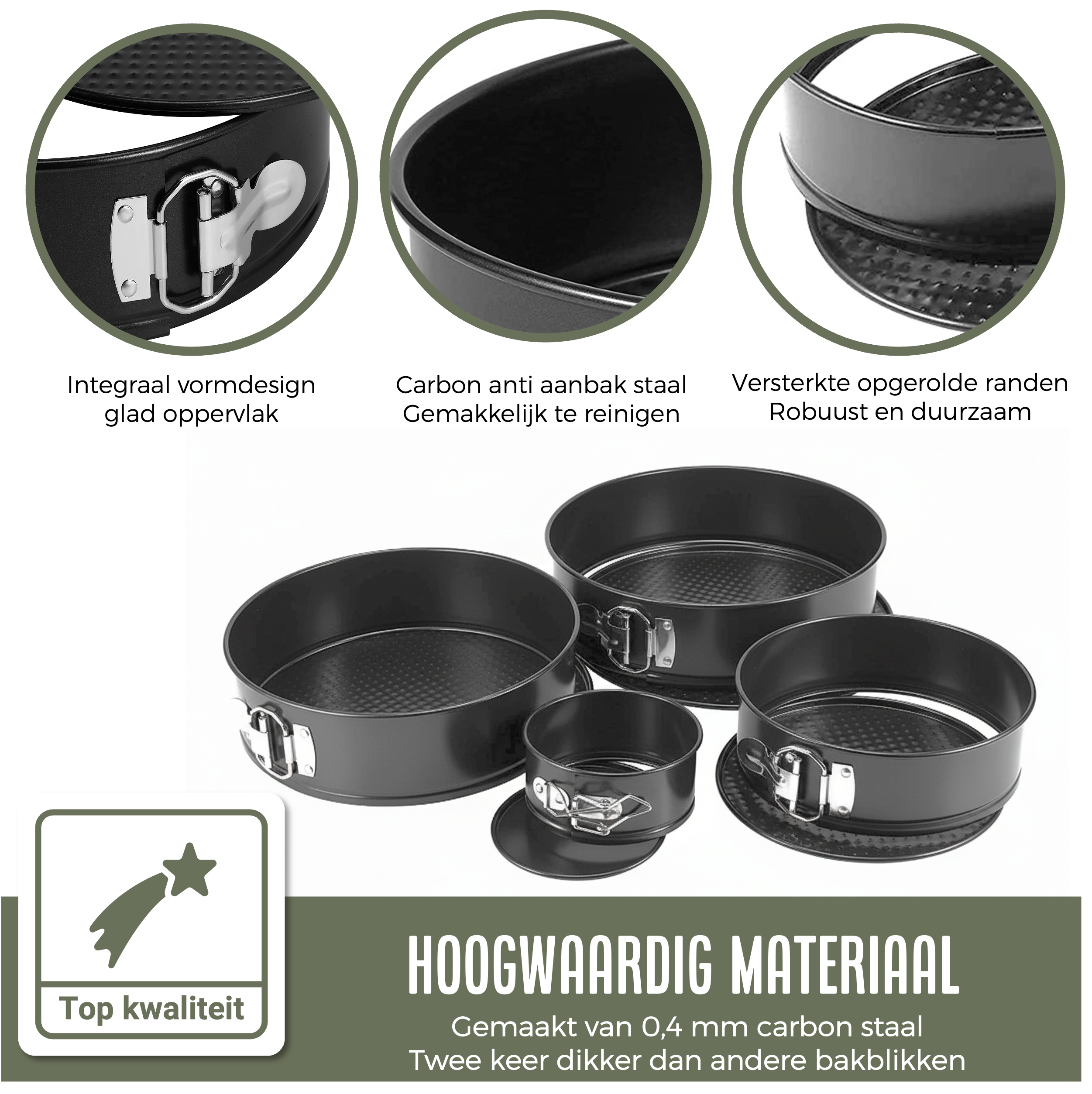 4-Delig Ronde Springvorm Set - Bakblik Rond - Taartvorm - Bakvorm met Anti Aanbaklaag - Maten 12 tot 28cm - Incl Deegschraper