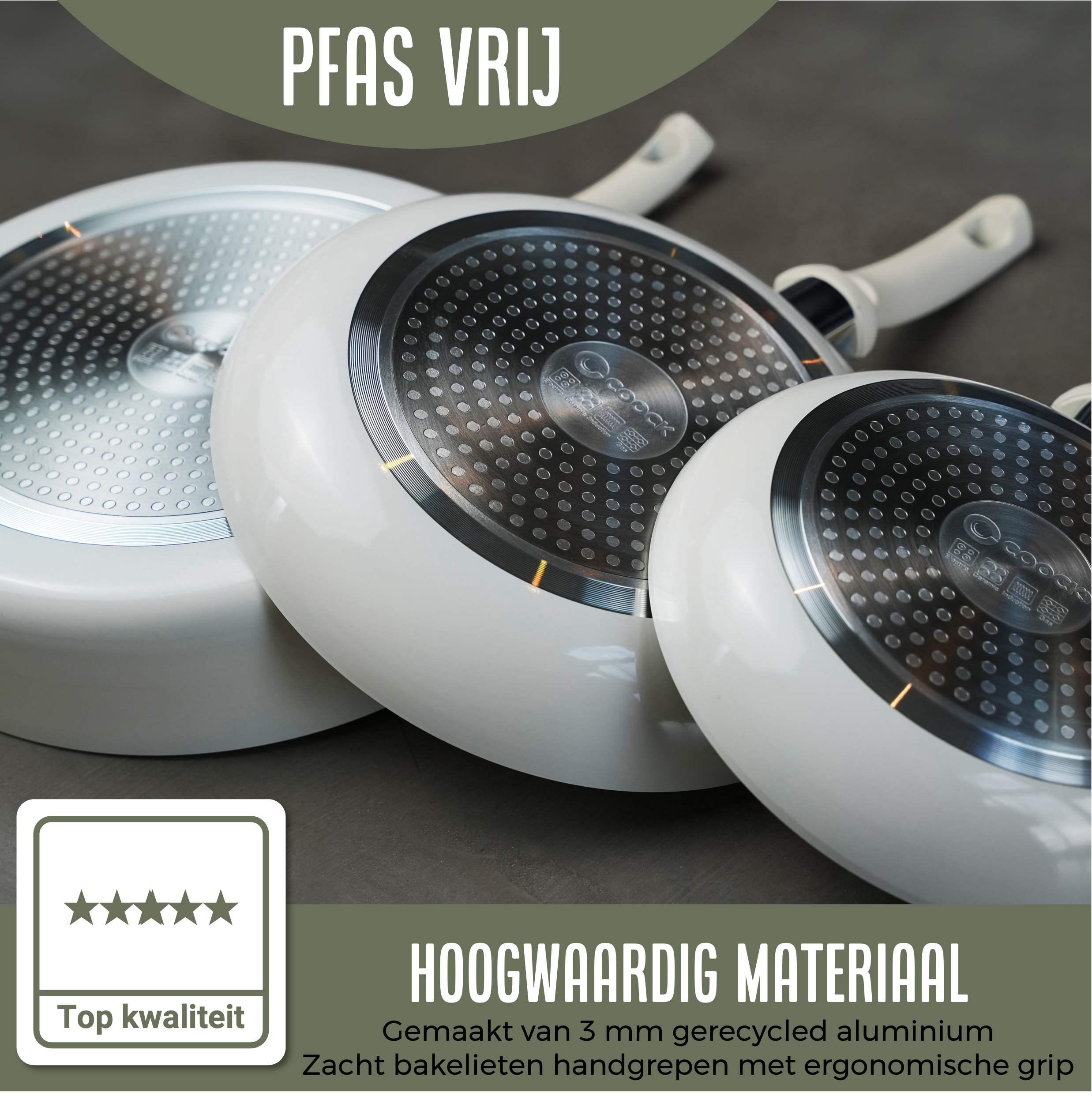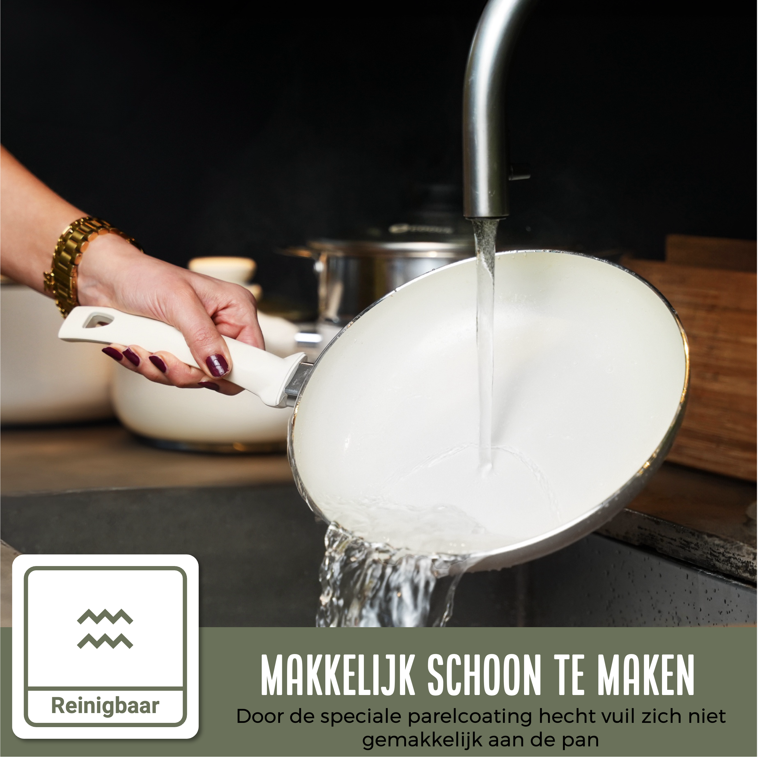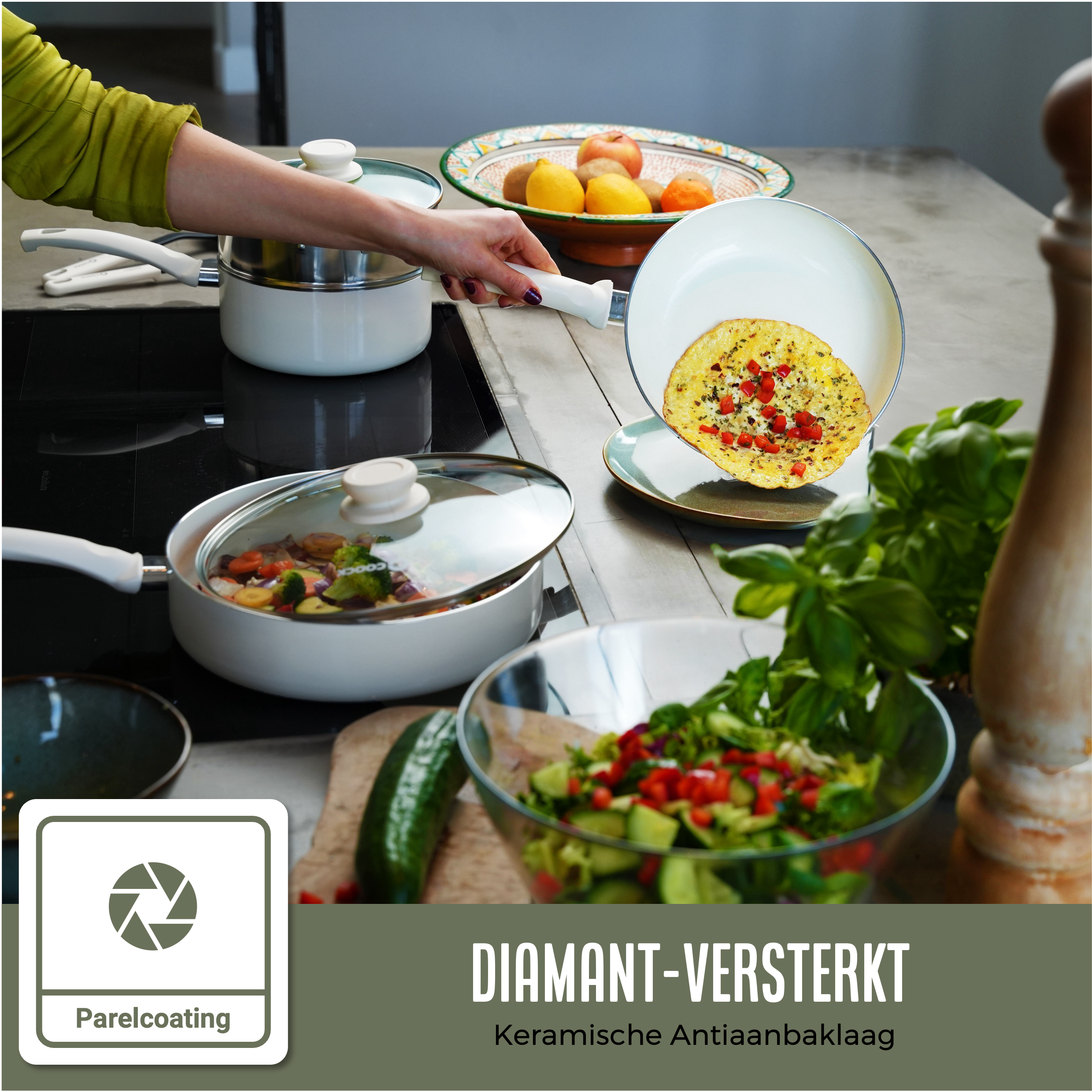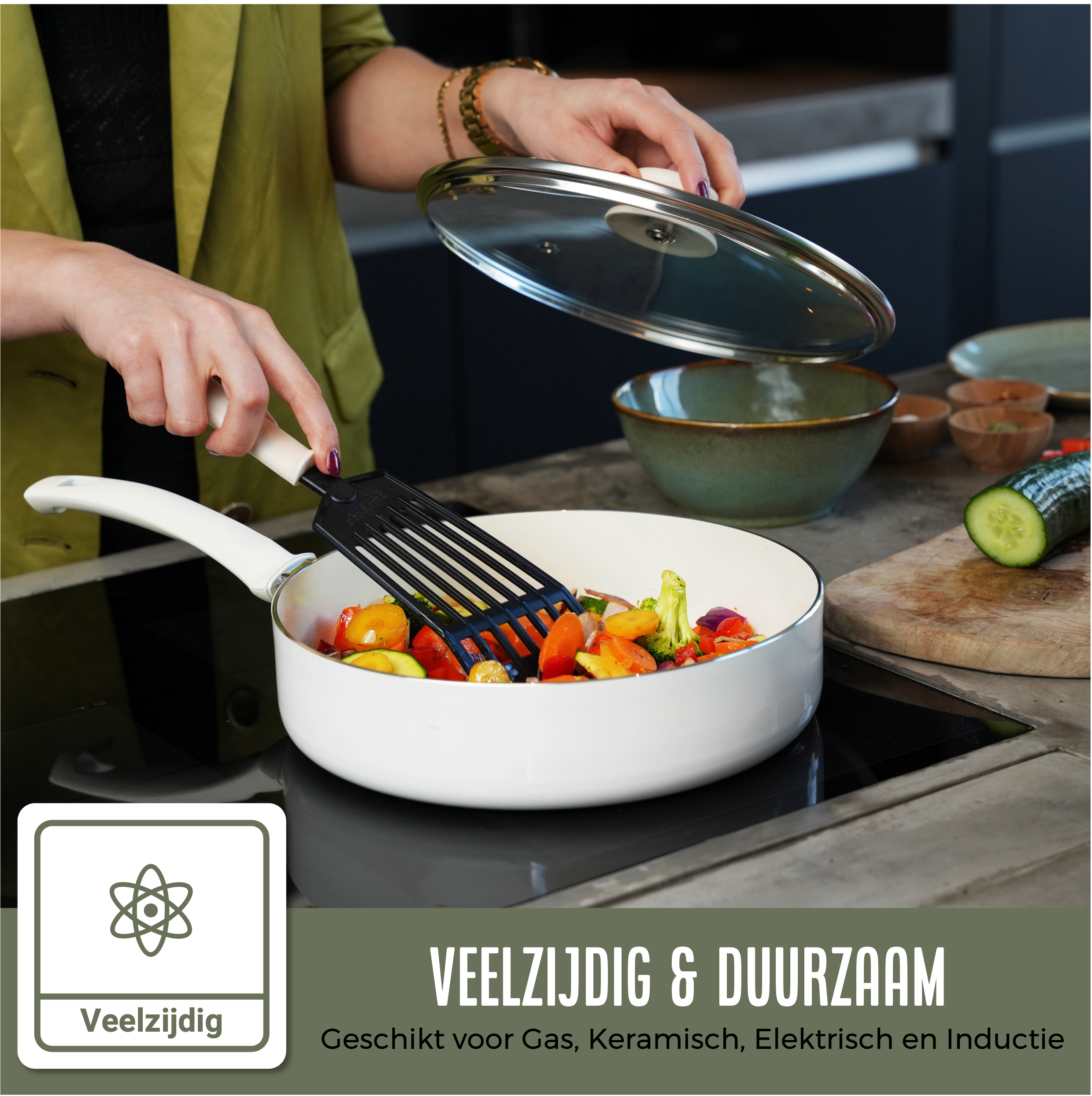 Steelpan met deksel Inductie - 2500ml - Speciale Anti-Aanbak Coating - Sauspan met Ergonomische Koudgrepen - Gerecycled Aluminium - Wit