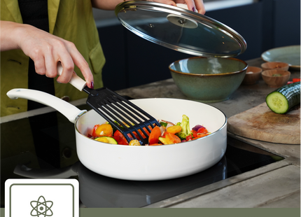 Met de Coock witte steelpan kun je genieten van de lekkerste gerechten zonder je zorgen te maken over je gezondheid. Dankzij de keramische anti-aanbaklaag heb je weinig tot geen olie nodig, waardoor je vetinname drastisch vermindert. De ergonomische handgrepen zorgen voor een comfortabele grip, zelfs tijdens het bereiden van zware gerechten. En dankzij de non-stick parelcoating is de steelpan een fluitje van een cent om schoon te maken.