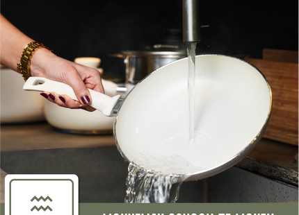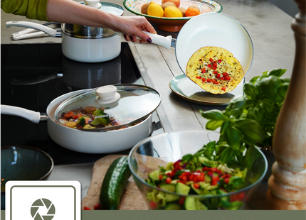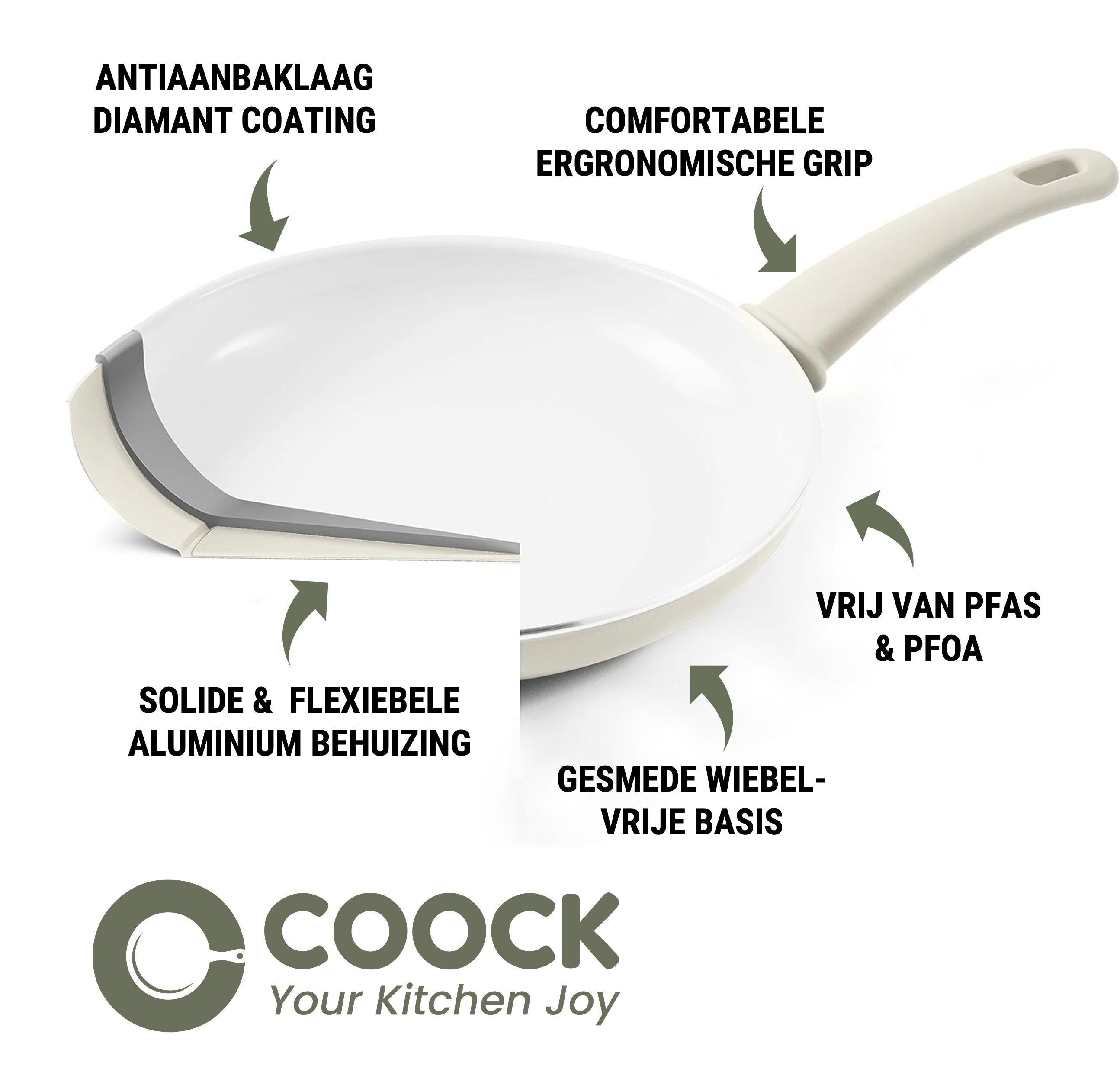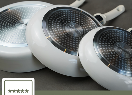 Gemaakt van 100% gerecycled aluminium en voorzien van een duurzame keramische anti-aanbaklaag, is de Coock witte steelpan de ideale keuze voor de eco-bewuste kok. Deze pan gaat jarenlang mee, waardoor je minder vaak een nieuwe pan hoeft aan te schaffen en je ecologische voetafdruk verkleint. De keramische coating is vrij van schadelijke stoffen zoals PFOA en PTFE, zodat je met een gerust hart kunt koken.