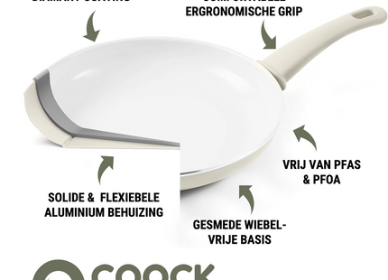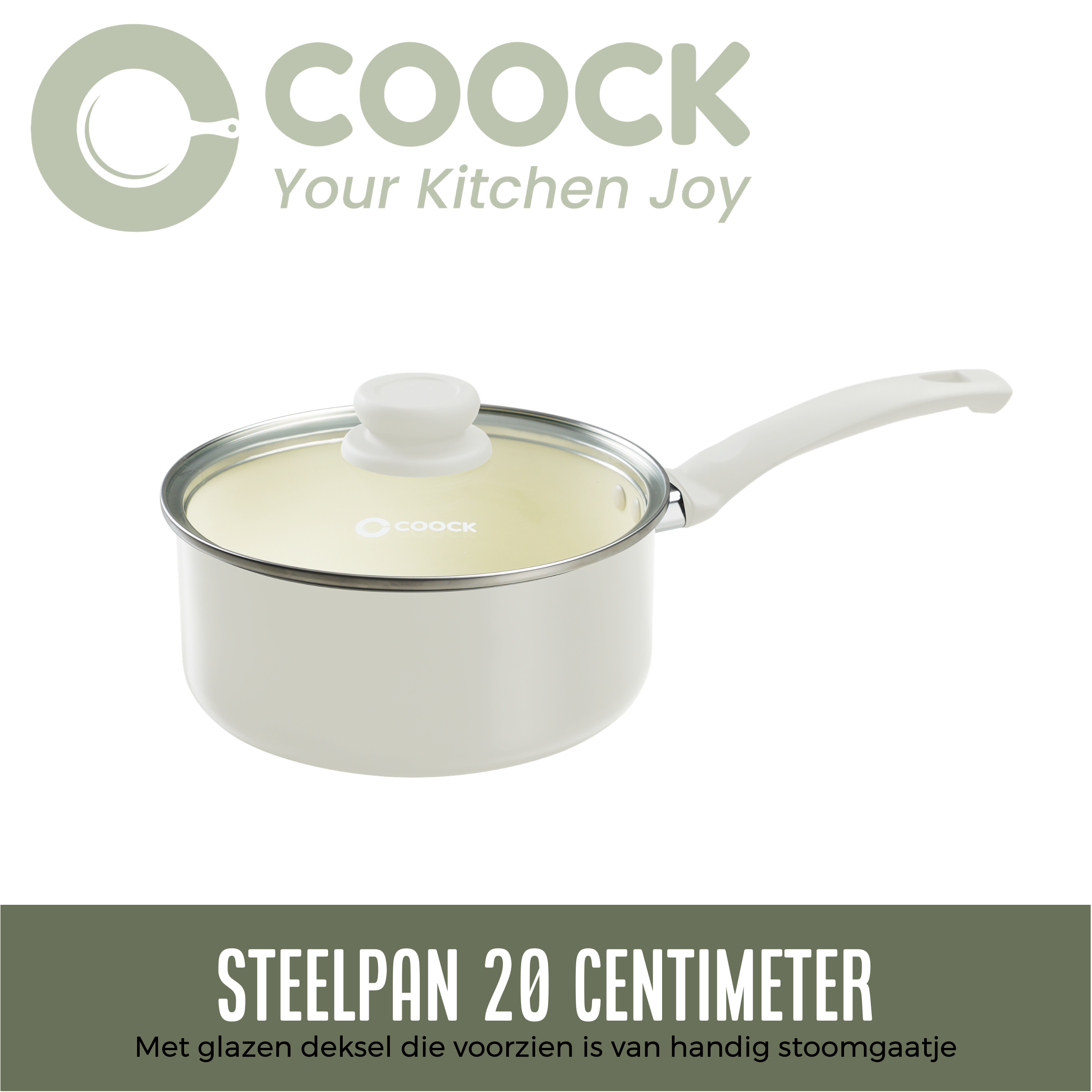 De witte Coock steelpan is ontworpen om het koken zo aangenaam mogelijk te maken. De lichte steelpan met ergonomische handgrepen zijn gemakkelijk te hanteren, zelfs voor beginnende koks. De keramische anti-aanbaklaag zorgt ervoor dat je eten niet aanbakt en is de pan een stukje makkelijker schoon te maken. Bovendien is deze geschikt voor alle soorten kookplaten, dus je kunt hem overal gebruiken.